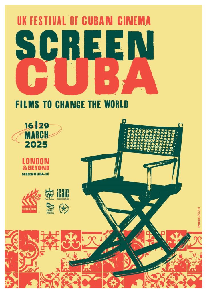 Roberto’s inspiration for our poster was to combine the feel of the traditional Cuban home – with tiles and rocking chair – with the film director’s chair, as well as the screen print aesthetic of Cuban film posters. Several of the films being screened this year reflect ordinary women’s lives and domestic conflict.