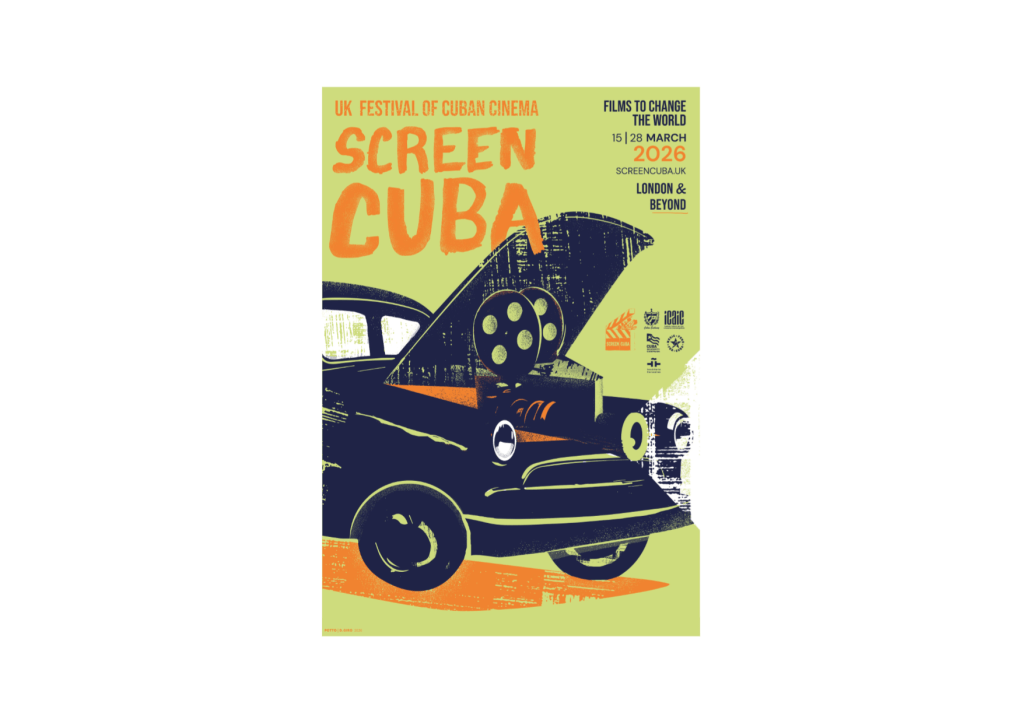 Blending tradition with innovation, the poster again shares the screen print aesthetic of Cuban film poster design. It draws inspiration from Cuba’s vintage cars that are emblematic of the country, but the car is reimagined with a cinematic twist: the hood opens up to reveal an old-style movie reel projector on top of the engine – ready for instant mobile cinema. It’s a joyful celebration, combining the inventiveness of the island’s people and its celebrated cinema, brought vividly to life.